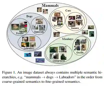 层级结构无处不在,自然界中存在「界 - 门 - 纲 - 类 - 科 - 属 - 种」这样的层级关系, 大规模自然图像数据集中也天然存在。例如,ImageNet 数据集的类别标签本身就是基于 WordNet 层级形成的, 我们总是可以「刨根问底」地找到某个类别的「父类」。举例而言,拉布拉多犬是一种犬类,而犬类又是一种哺乳动物。这就形成了拉布拉多犬 -> 犬类 -> 哺乳动物的层级关系。