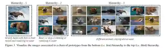 除了量化实验,该论文还给出了直观的可视化结果。研究者们展示了 HCSC 在 ImageNet 上的聚类结果,在下图中可以明显地看出存在层级结构:叼着鱼的灰熊 => 在水上的熊或者狗 => 在水上的动物。