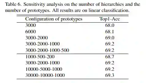 2. 在原型数量相同的情况下,带有层级结构的原型 (3000-2000-1000) 比单层原型 (6000) 取得更优的性能。这也印证了层级原型的有效性。另一方面,模型对进一步增加层级数以及各层原型的数量不敏感。