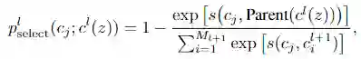 同样地,如果通过随机采样的方式形成负原型集合 N_c,那么其中也可能存在与聚类中心 c 语义相近的原型 (例如 c 的兄弟节点):如果某张图像是萨摩犬,选择相似的种类例如拉布拉多犬作为负例进行对比学习并不是一个好选项。而层级结构的存在为选择合理的对比原型提供了一个解决方案:与此前选择对比样本类似,我们只需要计算某一候选原型与目标原型的父节点的相似度,即可选择与目标原型大概率不是近似类别的原型,从而避免可能带来噪声的对比原型。具体而言, 某个聚类中心c_j被选择作为对比原型的概率为: