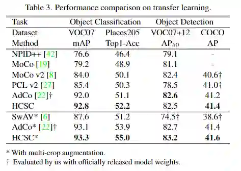 研究者们在 ImageNet-1k 线性分类、KNN、半监督学习以及跨数据集的迁移学习 (包括在 VOC、COCO 数据集的目标检测任务以及在 VOC、Places205 数据集的分类任务) 的实验设置下与基于 CNN 架构的 SOTA 方法进行了对比,HCSC 在多个任务中均取得了出色的效果。
