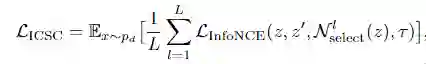 直观而言, 一个候选负样本被选择的概率可以近似被描述为「与目标样本属于不同聚类中心的概率」经过选择过程后, 更高质量的负样本集 将被用于计算 InfoNCE 损失. 在多个层级聚类中心指导下, 最终的选择性实例对比学习 (Instance-wise Contrastive Selective Coding, ICSC) 的损失函数为:
