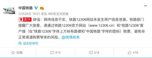 中国铁路总公司官方微博发布信息称,网传信息不实,铁路12306网站未发生用户信息泄漏。提醒广大旅客,请通过铁路12306官方网站(www.12306.cn)和“铁路12306”客户端(在“铁路12306”字体上方标有路徽和“中国铁路”字样的图标)购票,避免非正常渠道购票带来的风险。