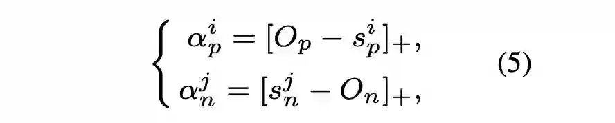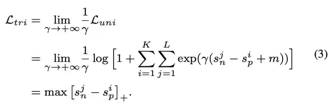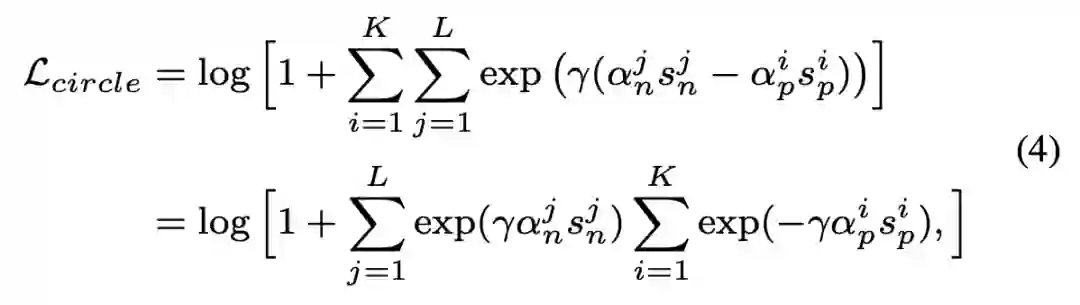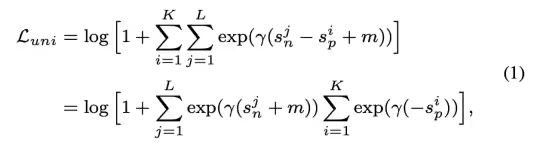 统一的相似性优化视角深度特征学习的优化目标是最大化 ,最小化 。在两种基本学习范式中,采用的损失函数通常大相径庭,比如大家熟知的 sofmax loss 和 triplet loss。这里不去在意相似性计算的具体方式——无论是样本对之间的相似性(相似性对标签情况下)还是样本与类别代理之间的相似性(类别标签情况下)。本文仅仅做这样一个假设定义:给定特征空间中的单个样本 x,假设与 x 相关的类内相似度分数有 K 个,与 x 相关的类间相似度分数有 L 个,分别记为 和 。为了实现最大化 与最小化 的优化目标,本文提出把所有的 和 两两配对,并通过在所有的相似性对上穷举、减小二者之差,来获得以下的统一损失函数: