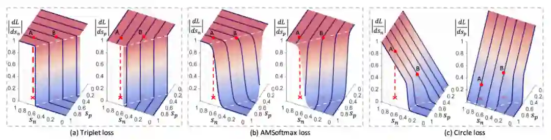 灵活的优化方式。在训练期间,向 或 的梯度反向传播会根据权重 或 来调整幅度大小。那些优化状态不佳的相似度分数,会被分配更大的权重因子,并因此获得更大的更新梯度。如图 1(b) 所示,在 Circle Loss 中,A、B、C 三个状态对应的优化各有不同;