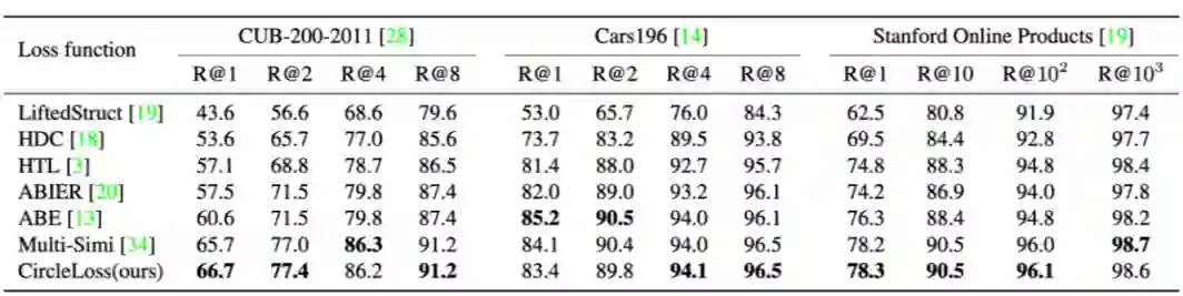 可以看到,在上述三个任务中,Circle Loss 都表现出非常强的竞争力。在人脸上,采用分类模式,Circle Loss 超过了该领域先前的最好方法(如 AM-Softmax,ArcFace);在细粒度检索中,采用样本对学习方式,Circle Loss 又媲美了该领域先前的最高方法(如 Multi-Simi)。