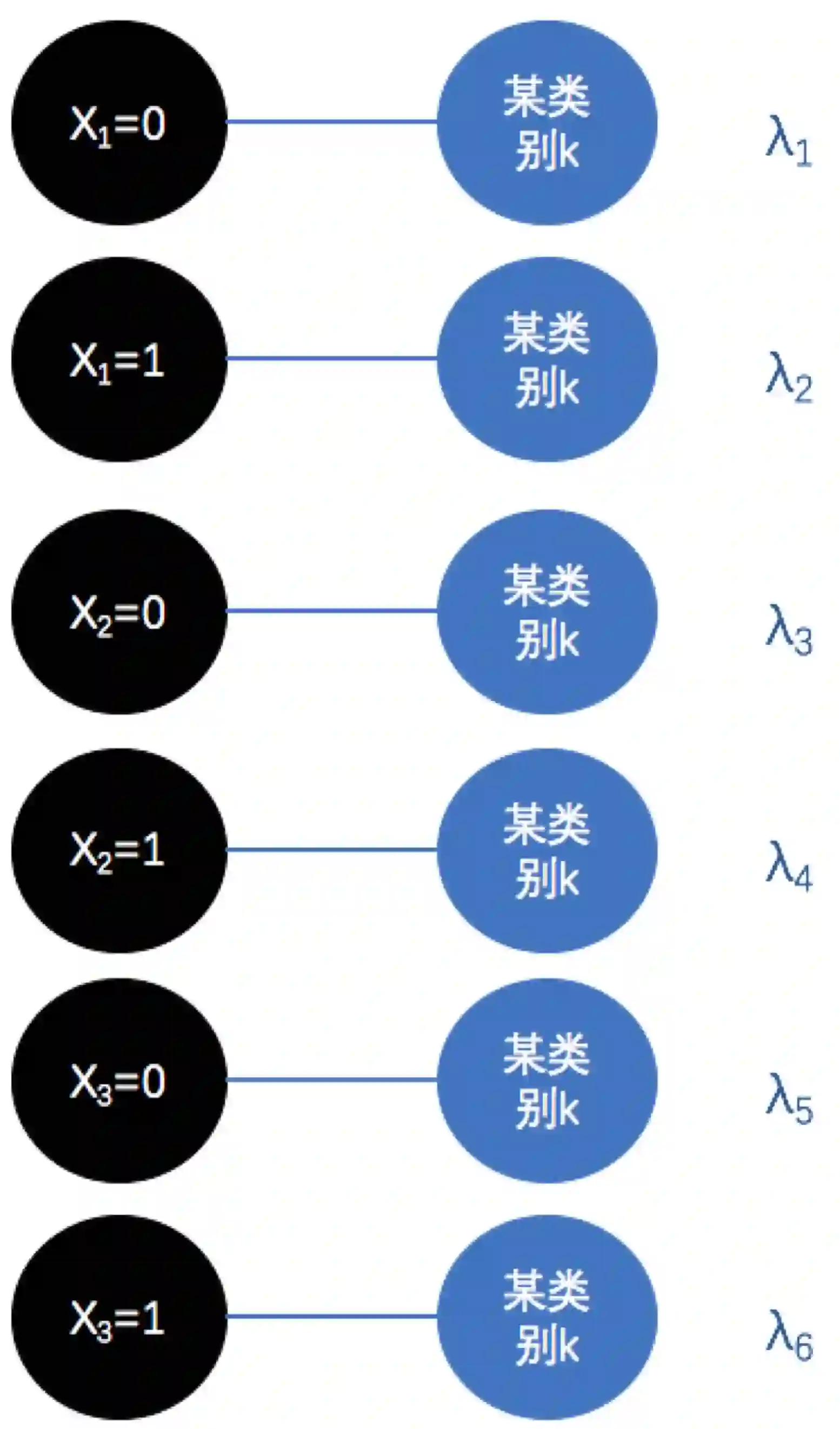 也就是说,我们可以将X的每一维度特征下的每个取值与某个类别配对,并同样的用一个参数来描绘这个配对的紧密程度(认为这一对完全不可能成的话即让这一组的参数为0呗),这样的表示看起来好像等价于上一种表示方法,然而实际上我们也注意到了,模型的参数由3个变成了6个,这说明后一种表示方法更加灵活,理论上可以建模更多的信息。为什么这样说呢?