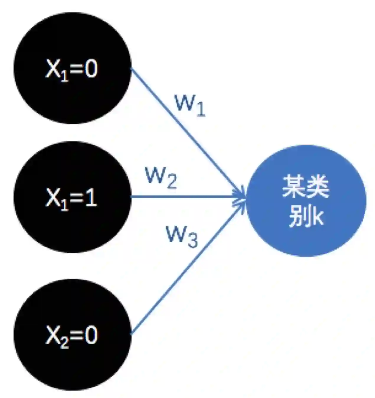 这个图即样本用3个特征表示,通过参数w将这三个特征的值加权得到某类别的判别程度。然而这个图,其实我们可以换一种角度来表示,比如我们假设每一维度的特征有两个取值0和1,那么上图可以表示成: