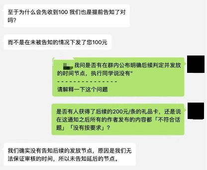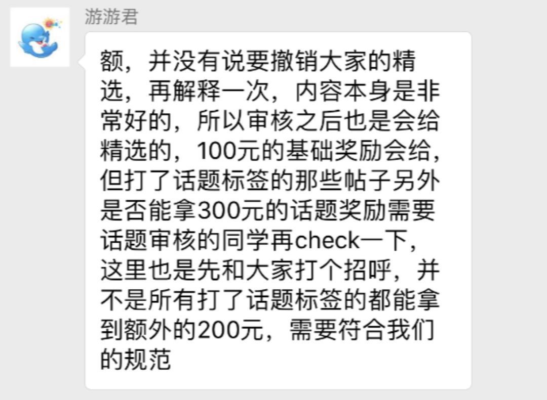 具体细节为2018年11月28日,旅拍就拉了两个四百多人的KOL群,12月17日旅拍开始推话题,带标签特定话题旅拍,300一条。随后,在所有人已经发布了一系列话题下内容的时候,突然在12月25日告知,12月17日之后的话题精选贴由统一300变成100-200元,期间补贴的差价需要再度审核才会发放。同时宣布:因为话题旅拍已经达到了预期数量,活动在当晚提前结束。而至于剩下的200什么时候发,则没有告知明确的时间节点。