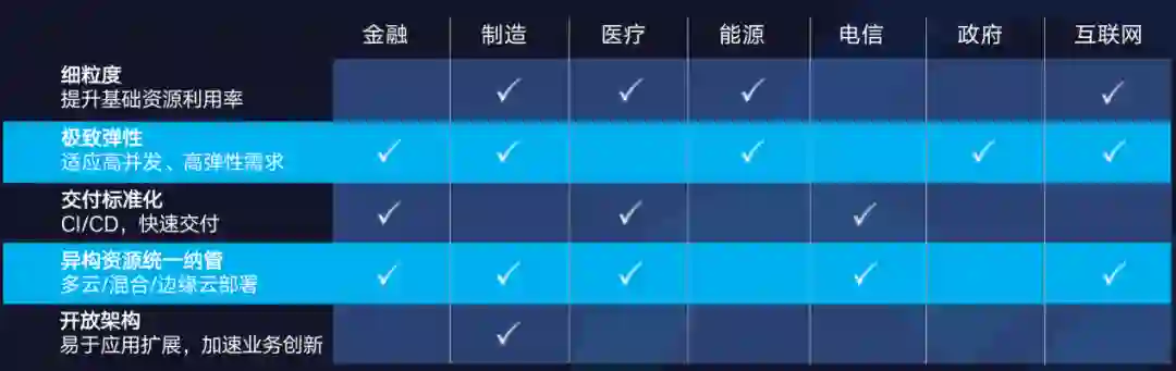 金融、制造、医疗等行业对云原生技术的应用逐步深入,企业对云原生应用的关键需求日渐清晰,细粒度、极致弹性、交付标准化、异构资源统一纳管、开放架构是企业对云原生的主要关注点。同时,据中国信通院调查,不同行业对云原生应用的核心诉求存在一定差异。