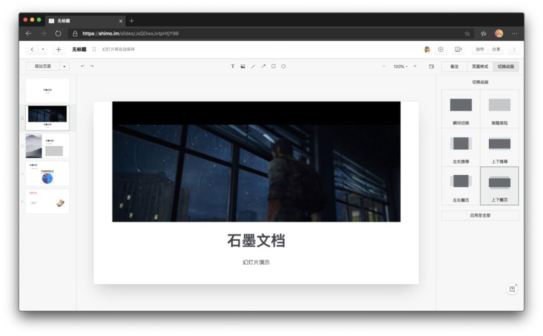 动画效果上,石墨支持淡入淡出、左右/上下推移/翻页等切换动画,选择不算多,而且不支持控件动画。