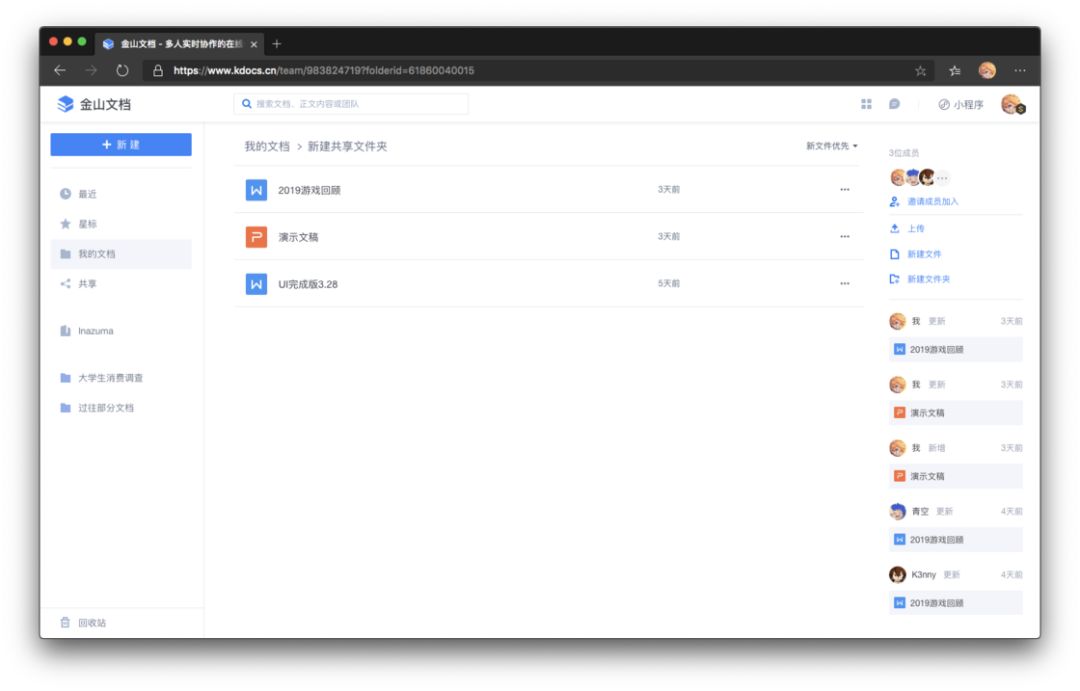 另一个金山做得不错的地方,意外地是在界面设计上:首先所有权限操作都可以直接在文件夹界面内完成,其次右下角还会显示成员的历史操作记录,布局与功能入口都清晰且合理,是三家中我个人认为最赞的。
