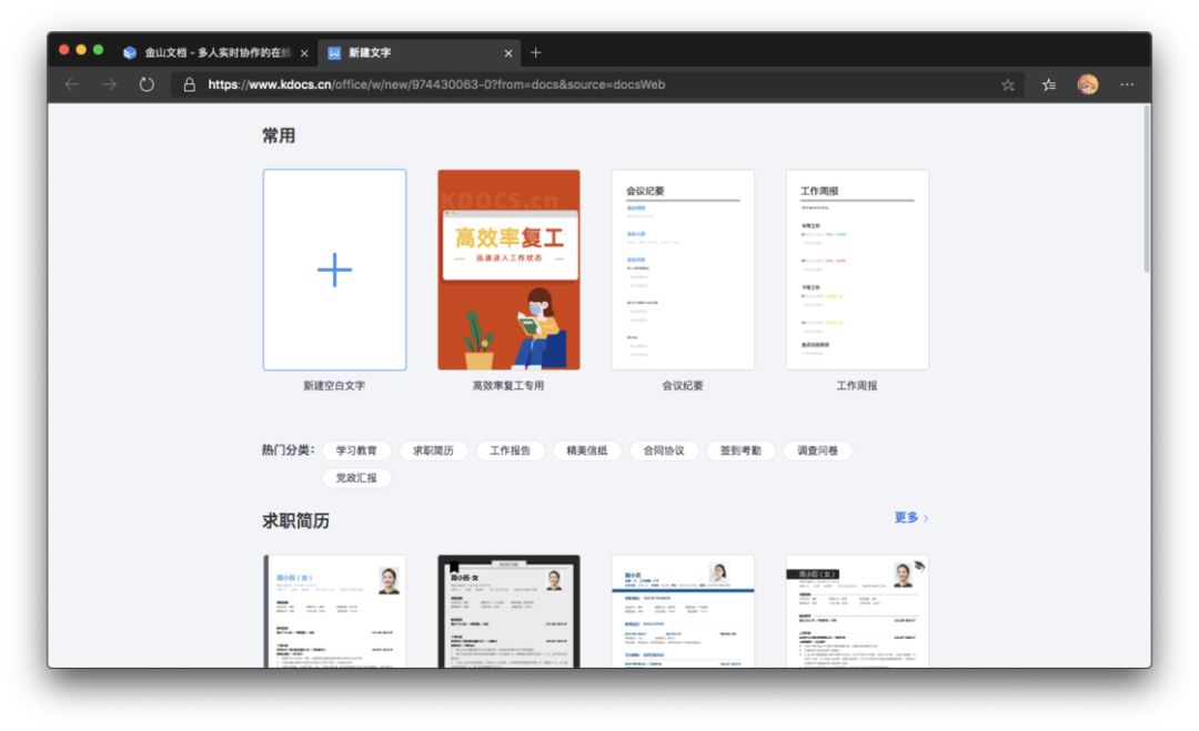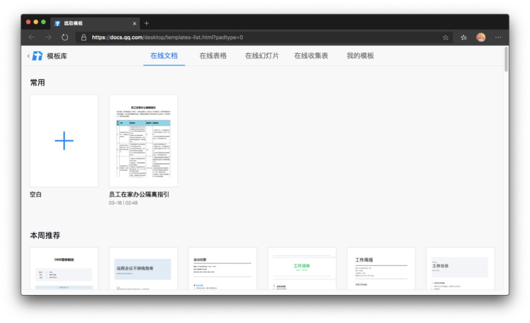 金山和腾讯都可以直接在下拉菜单中选择文档类型,然后再选择用模版创建或是新建空白文档,交互逻辑上相比石墨更符合直觉,而且也都设计了一些抗疫期间可能用得上的主题模版。