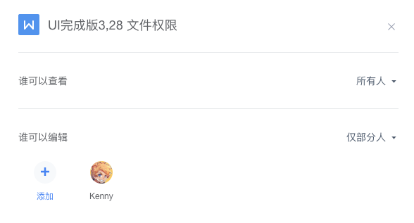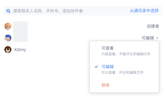 对于协作者,你可以设置「只能阅读」、「只能评论」和「可以编辑」三种权限,不过前两种在办理企业版后才能选择。