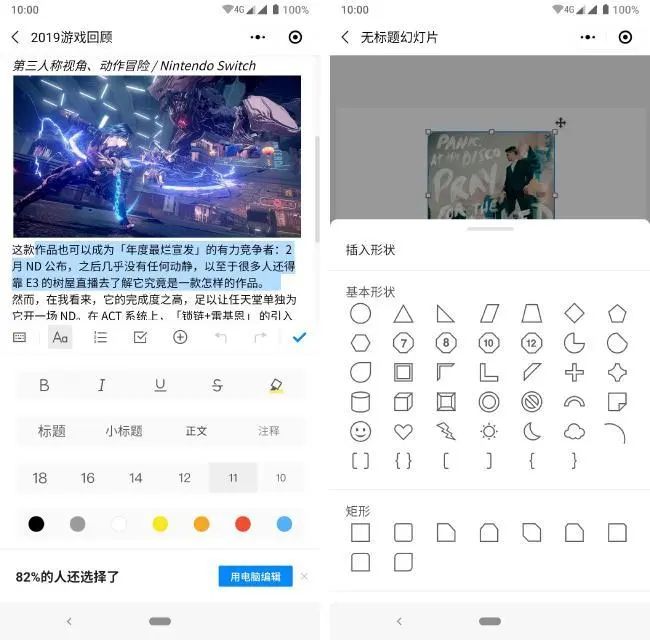而腾讯文档的小程序,在功能上大约介于金山和石墨之间,对于文字和表格而言还是稍逊于金山,但幻灯片可以添加形状这一点,着实是惊到了我。