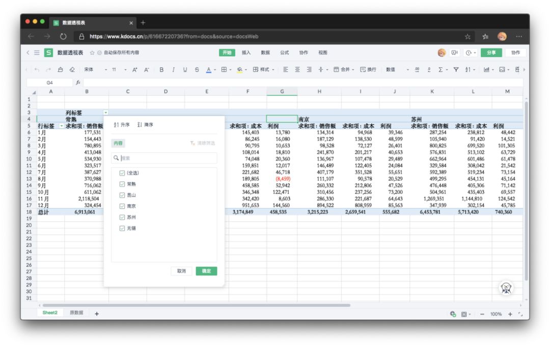 在表格这一块,金山依旧延续了其在兼容性上的优势;有趣的是,虽然金山文档似乎并未提供数据透视表的编辑器,但它可以正常显示 Excel 生成的数据透视表,内容上没有发现错误,也能对行列标签进行筛选。