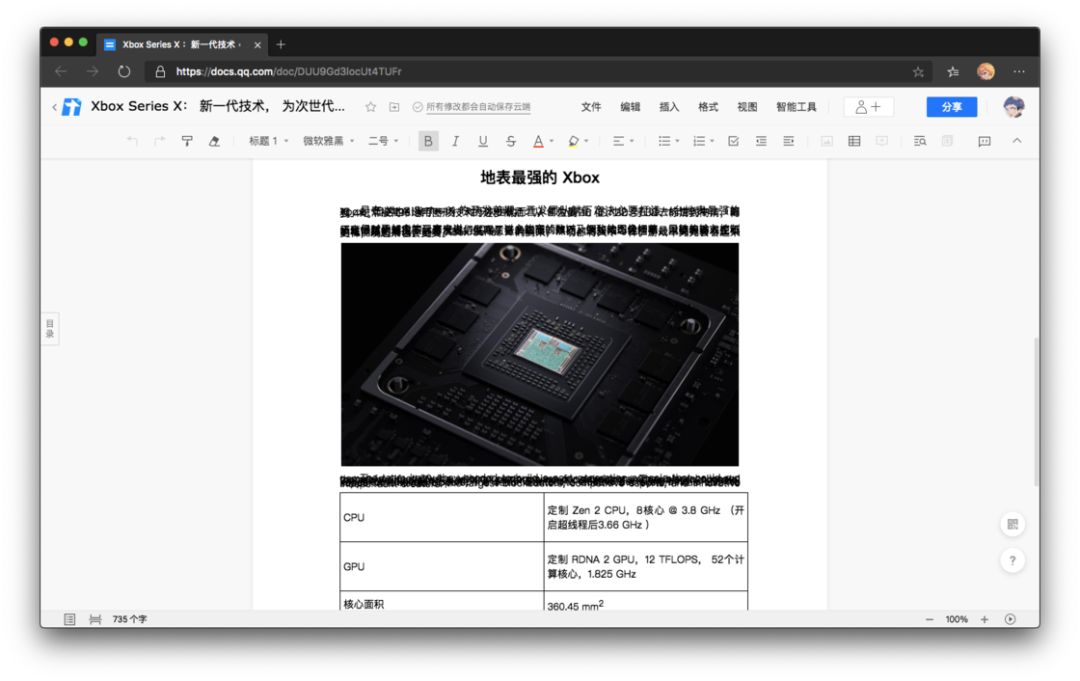 腾讯文档也支持 .doc / .docx 格式等文件的导入,它的界面设计介于石墨和金山之间,采用了工具栏 + 下拉菜单的布局,功能的设计上则更像是在向 Word 靠拢。