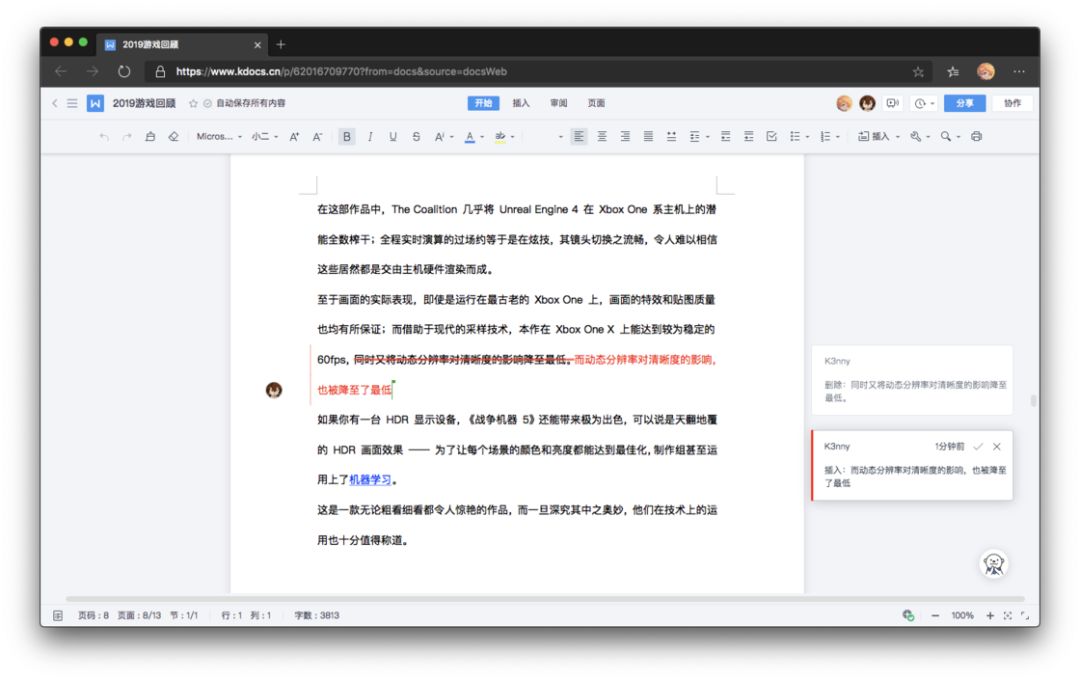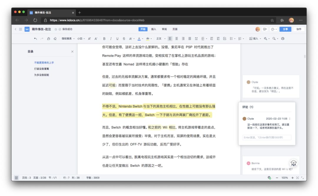 值得一提的是,对于已插入批注的 Word 文档,上述三家工具中只有金山能正常显示批注的人员和内容。在全面转移至「云端」之前,仍然会有很多办公场合使用 Office 进行本地批注;考虑到这一点,我不得不对金山的兼容性点个赞。