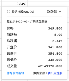 腾讯表格在基础功能上做得有板有眼,同时还提供了一些特色功能,例如 ID 和 STOCK 这两个专属函数。前者可以根据身份证号码获取年龄、性别、出生年月等信息;后者则可以获取指定股票前一交易日的报价、涨跌幅、市值等数据。