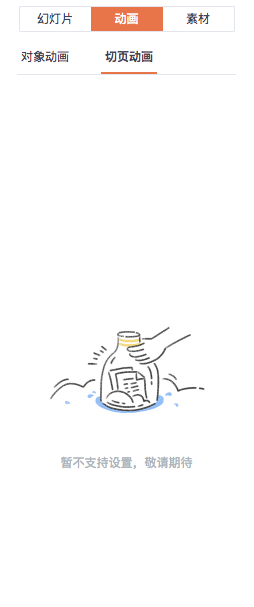 正当我满心欢喜地打算看看它支持的动画效果时,现实却迎面给我浇了一瓢冷水 —— 切页动画显示「暂不支持,敬请期待」,对象动画也只支持「飞入」和「消失」两种。