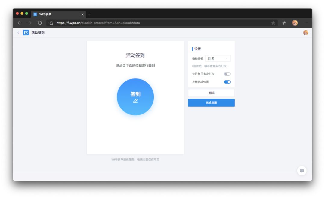 除了传统的表单,金山还能创建一种「打卡」表单;这种表单中间只有一个按钮,可以选择是否记录地理位置。用来实现简单的打卡和签到功能,还是相当方便的。