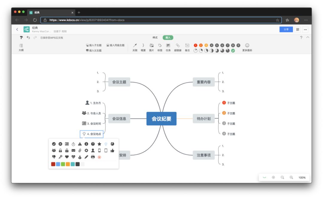相较之下,金山的重心更多放在了导图的样式与可插入的内容上。与石墨文档灰扑扑的风格不同,金山可以自定义各节点、连线与背景的颜色,能插入的内容也不仅限于图片一种;标签、任务等元素的支持,对那些利用思维导图理清工作思路的用户而言,无疑会相当便利。