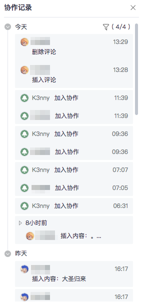 虽然支持大版本的自动保存,但金山同样提供了文档编辑历史记录,以时间轴的方式呈现,而且可以单独筛选出部分协作者进行的操作。唯一的缺点是,这个记录不能很好地呈现出修改的具体位置。