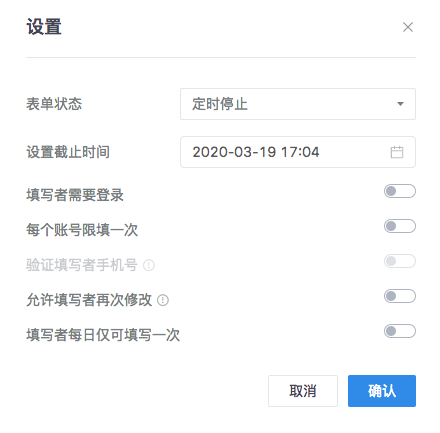 在表单权限上,金山是最为全面的,可以设置的项目包括定时停止收集、要求填写者登录、验证手机号、是否允许修改、是否允许多次填写等。