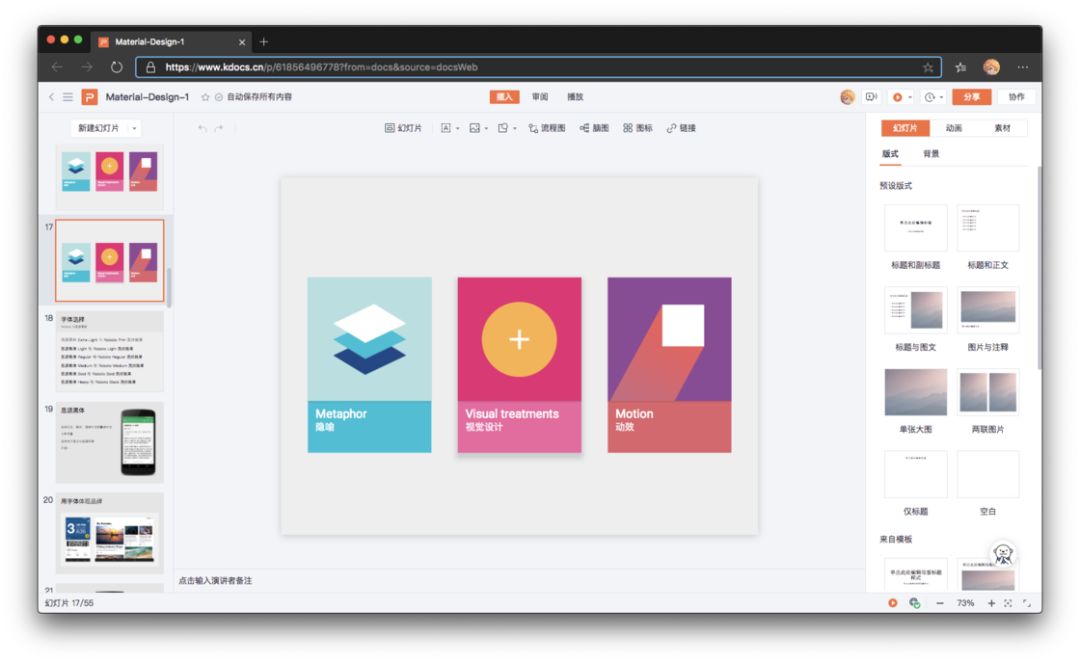 制作幻灯片时,金山文档能插入的对象比较丰富,除了基本的文本框与图片之外,它内置的形状种类也非常之多,同时还提供了「流程图」与「思维导图」;但目前还没有加入对表格和图表的支持,这点稍显遗憾。