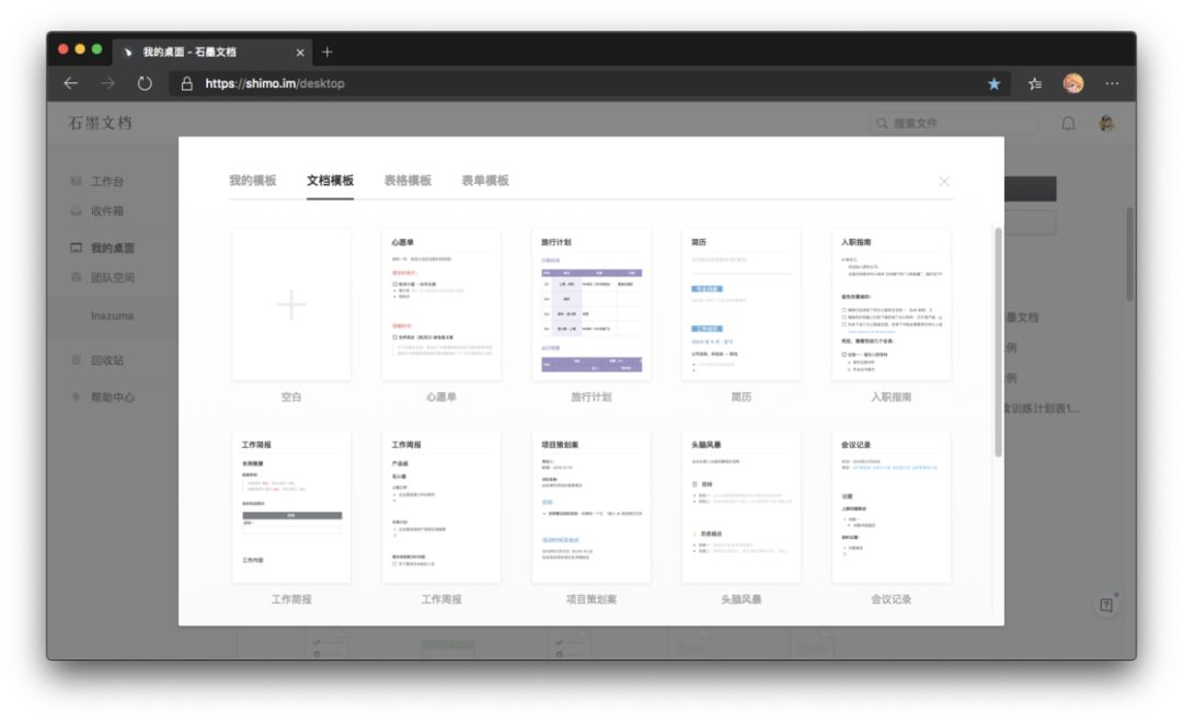 石墨提供的模版种类最少,文档类的模版更倾向于配合多人协作的场景;和另外两家不同,它也没有提供任何疫情防控主题的模版供用户选择。