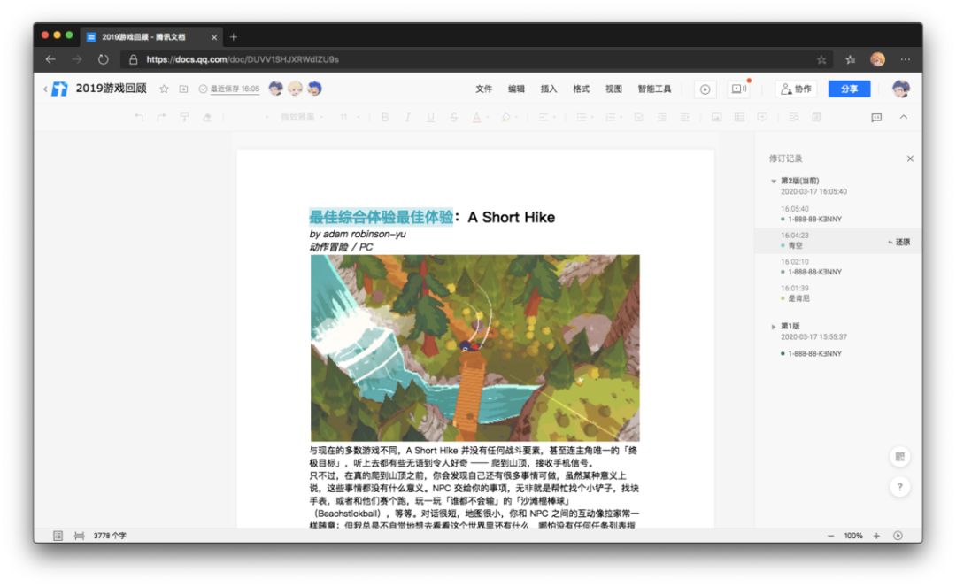 在其他协作特性上,腾讯的不足就比较明显了。首先,腾讯对于修改痕迹的显示非常不明显,既不会像石墨一样进行标记,也不能像金山一样切换到「修订」状态;其他协作者能看到的只有一个很小的光标,而且腾讯不会在行的左侧显示头像,点击标题栏上的头像,也不能跳转到协作者所处的位置。