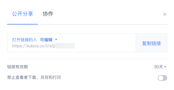 三家文档都支持通过链接或者二维码/小程序码分享某个文件。石墨文档的分享设置非常简单直接,只有一个「公开分享」开关,打开后可以选择是否允许获得链接的人编辑文档。虽然它还提供了密码保护功能,但只有企业版才能使用。