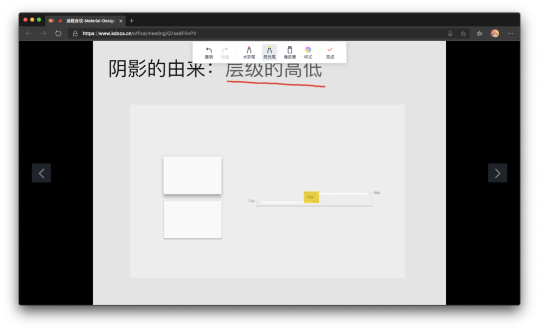金山文档同样支持语音通话,可以手动关闭某个人的麦克风,或者直接设置全员禁麦。在激光笔功能的基础上,金山追加了水彩笔、荧光笔等标注工具。