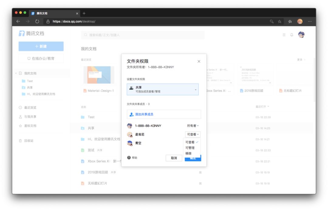 相比之下,腾讯在团队协作这一块提供的功能就显得有点少了。它没有类似于「团队」或者「企业」这种空间功能,只提供「共享文件夹」这一种特性,目录中的文件可以分别设置权限,但必须要打开文件后,在上方的协作菜单进行修改,批量操作起来要麻烦很多。