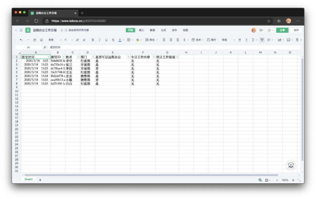 对于收集到的统计数据,三家都能与表格文件进行关联,并作为 Excel 文档进行导出。其中石墨和金山可以将统计结果在后台以图表的形式显示,石墨为表格 + 柱状图,金山则为表格 + 饼图。