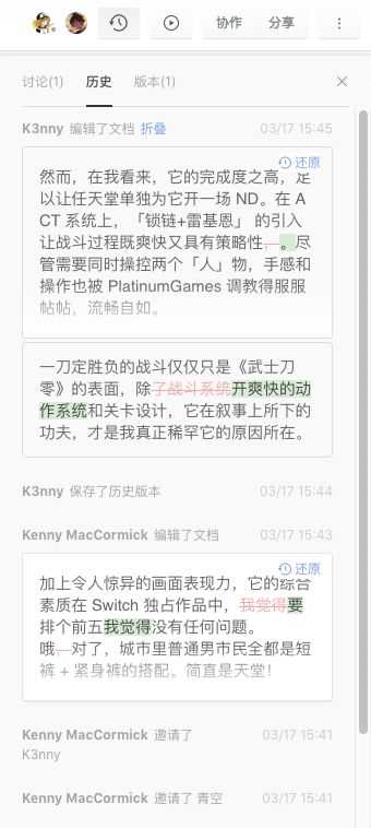 只有打开修订记录后,用户才能看到比较具体的修改内容。这个修订记录类似于大版本保存,但和金山文档相比,不同版本之间的修改次数和区别体现得不是很直观,除非仔细地滚动整个页面,否则内容上的差异根本无从得知。