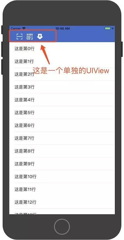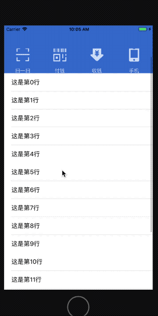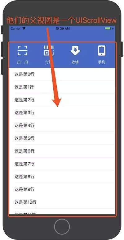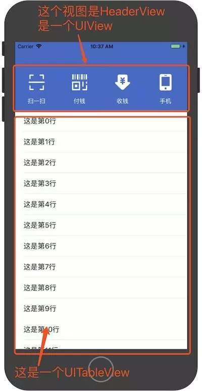 图片已经标明的很明白,我们在控制器先放上一个UIScrollView,在它的上面分别放上一个HeaderView(UIView)和一个UITableView。这时需要控制UITableView不能滑动,并且在设置高度时保持和行高*行数一致,也就是说这个方法适用于一些UITableView不必显示过多的页面,这里面不参与UITableView的复用,所有的Cell在一开始就显示出来了。ok,文字永远是枯燥的,上代码先: