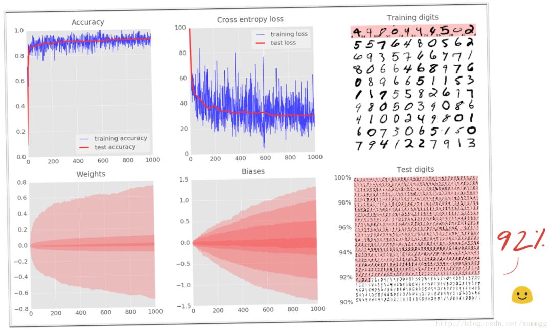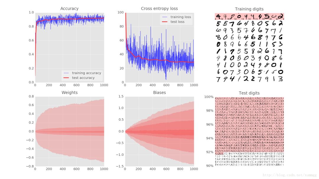 最后两行计算正确识别的数字的百分比。留给读者使用TensorFlow API参考书,以供读者理解。你也可以跳过它们。