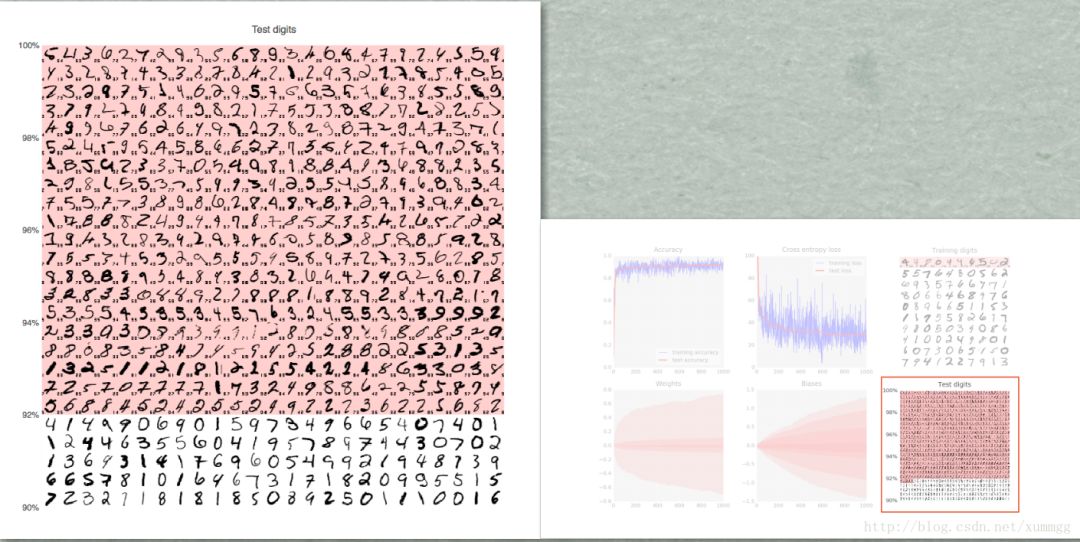 为了测试训练好后模型的识别质量,我们必须使用系统在训练期间没有用到过的手写数字。否则,模型可能会识别所有已训练的数字,但仍然不能识别我刚才新写的数字“8”。MNIST数据集中包含10,000个测试手写数字。在这图里,您可以看到大约1000个数字,其中所有被识别错误的,都放在顶部(红色背景上)。图左侧的比例可以大致表示分类器的准确性。