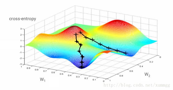 在该图中,交叉熵表示为2个权重的函数。实际上还有更多的。梯度下降算法遵循最快速下降到局部最小值的路径。训练图像也会在每次迭代中更改,以便我们收敛到适用于所有图像的局部最小值。