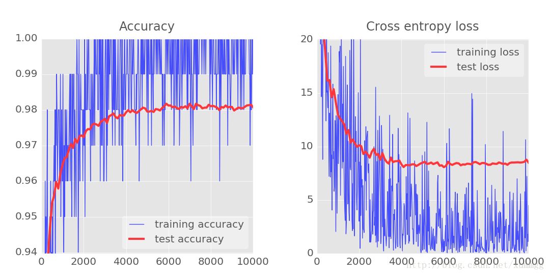 您将注意到,测试和训练数据的交叉熵曲线在数千次迭代后开始断开连接。学习算法仅用于训练数据,并相应地优化训练交叉熵。它从来没有看到测试数据,所以毫不奇怪,一段时间后,它的工作不再对测试交叉熵产生影响,测试交叉熵停止下降,有时甚至反弹。