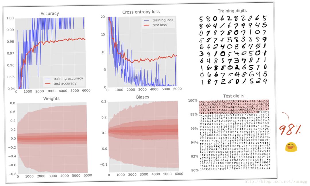 要完成,这是对我们更大的卷积网络的差异。给神经网络增加自由度,将最终准确度从98.9%提高到99.1%。增加dropout不仅驯服了测试损失,而且使我们能够安全地航行99%以上,甚至达到99.3%