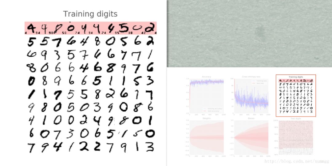 在这里,您可以看到100个训练数字被送入训练循环,注意是一次100个数字,这图显示的是这100个手写数据被训练的结果。在目前的训练状态下,神经网络已经能识别(包括白色背景和部分数字),当然也有些是识别错误的(图中红色背景的是计算机识别错误的手写数字,左侧小打印的数字是该书写字的正确标签,右侧小打印的数字是计算机标识别的错误标签)。
