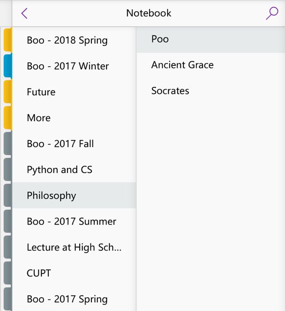 OneNote 笔记本分「笔记本 - 分区 - 页面 - 子页面」几个层级。我的 OneNote 中有许多笔记分区,但并没有用「笔记本」概念进行区分,而是一堆分区按时间顺序垒在一起。每一个分区对应生活中的进行的一个「项目」:比如一门课的上课笔记,分多页记入同一分区,读这本书是为一个「项目」;或者一场活动的策划,各种笔记和材料分多页记入同一分区,这个活动是为一个「项目」。在若干分区之间插入一个以「BOO + 时间」的格式命名的新分区,隔开各个时期创建的分区。而这样的新分区下储存的页面则是日记,记下各个项目的进展情况,以及日常见闻。