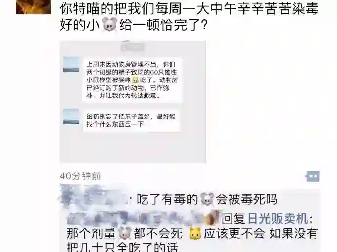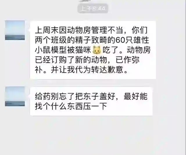 @石小兔呗:说个不太惨的吧,动物房装修,找了个一层仓库放老鼠,没有空调,怕热死老鼠,就把仓库的窗户打开了…今天师妹过去看老鼠,发现一只白猫从里面出来…没有实质性损失,也还好师姐5w的模型鼠没进来。
