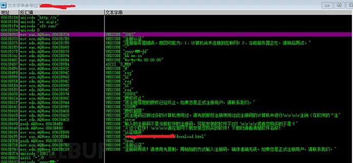 再回到我们的汇编窗口中,我们可以看到几个unicode的编码,疑似服务器的返回,记录下来。