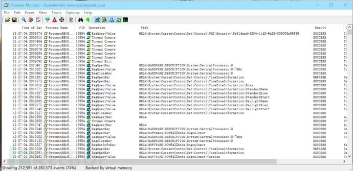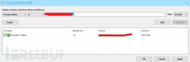 现在我们打开Process Monitor,使用过滤功能添加白名单使Pm仅显示该进程的相关信息。