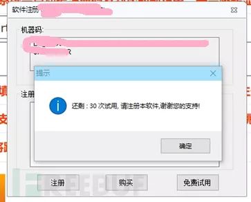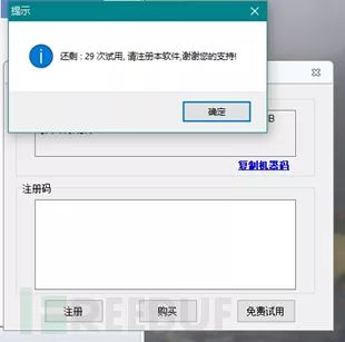 某些软件虽然使用网络进行授权验证,但是由于其试用次数设计的验证缺陷,可以导致通过修改注册表来实现无限次数的试用,导致“不付费也能用”,即出现了授权认证漏洞。下面这款客户端程序即是如此,我们在刚刚打开它的时候会提示试用次数还剩29次。