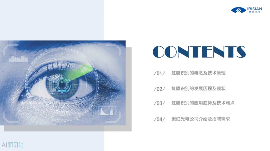首先来看一下公司的简介,聚虹光电是国内最早进行虹膜识别研究的技术团队,如下图所示,详细讲解请观看视频回放: