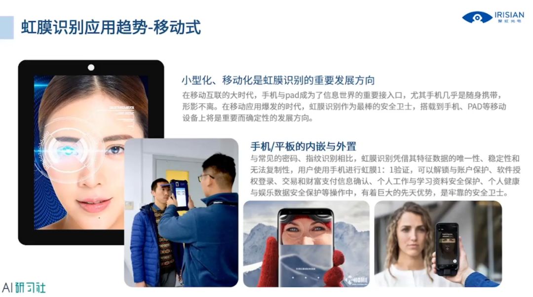 第二个是移动式,移动式、小型化实际上是生物识别发展的一个方向,这里可以提到两种产品形态。一种是三星之前提到过并把它产品化的Galaxy系列,把虹膜识别集成到手机的前置摄像头,可以完成用户的虹膜解锁或者虹膜支付,这是三星在手机上做的虹膜识别的应用形态。另一个是专用的移动设备如手机、平板,详细讲解请观看视频回放: